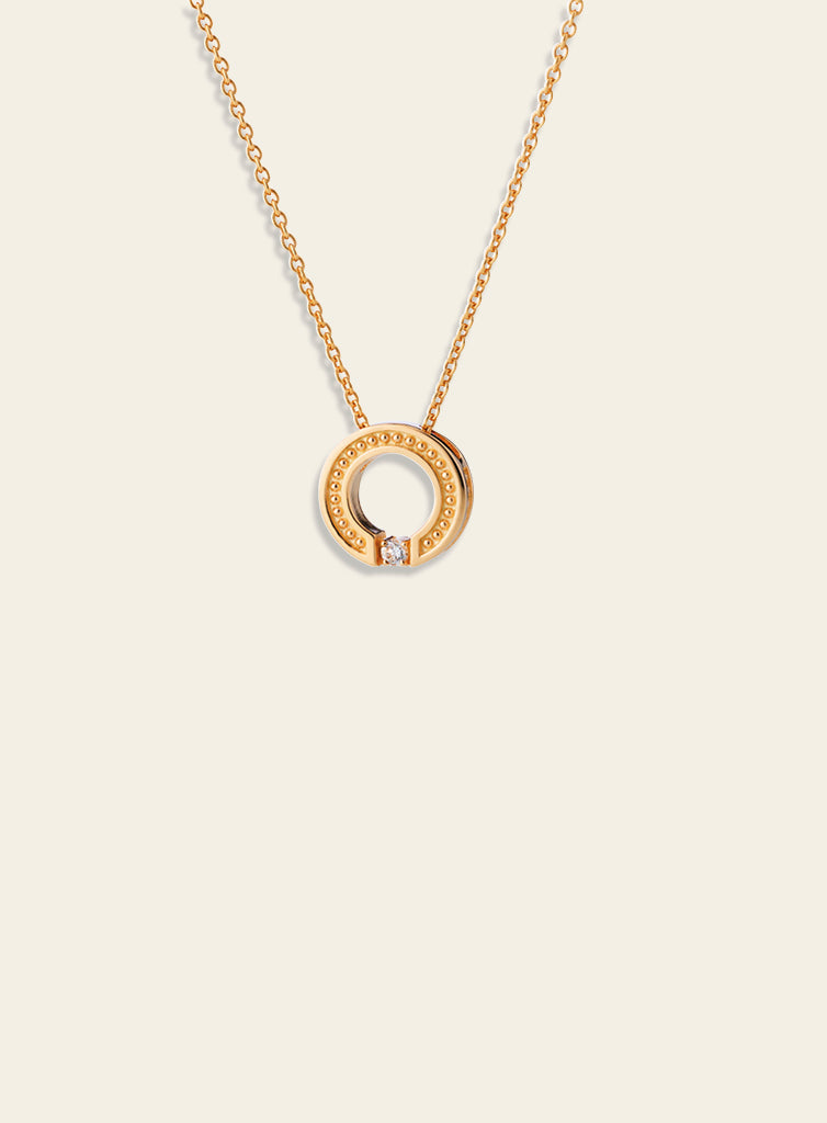 The clear shape of the Aina pendant is combined with a pearly border and a high-quality w/vs lab-grown diamond, which gives the calm shape a precisely focused sparkle. This series combines clarity and subtlety. It is not tied to the season but designed to last over time – the kind of jewelry that always works, regardless of the situation or style. The size of the jewelry is 11mm and the diamond weight is 0.03ct, the pendant is available with two different chain lengths: 45 cm or 50 cm.