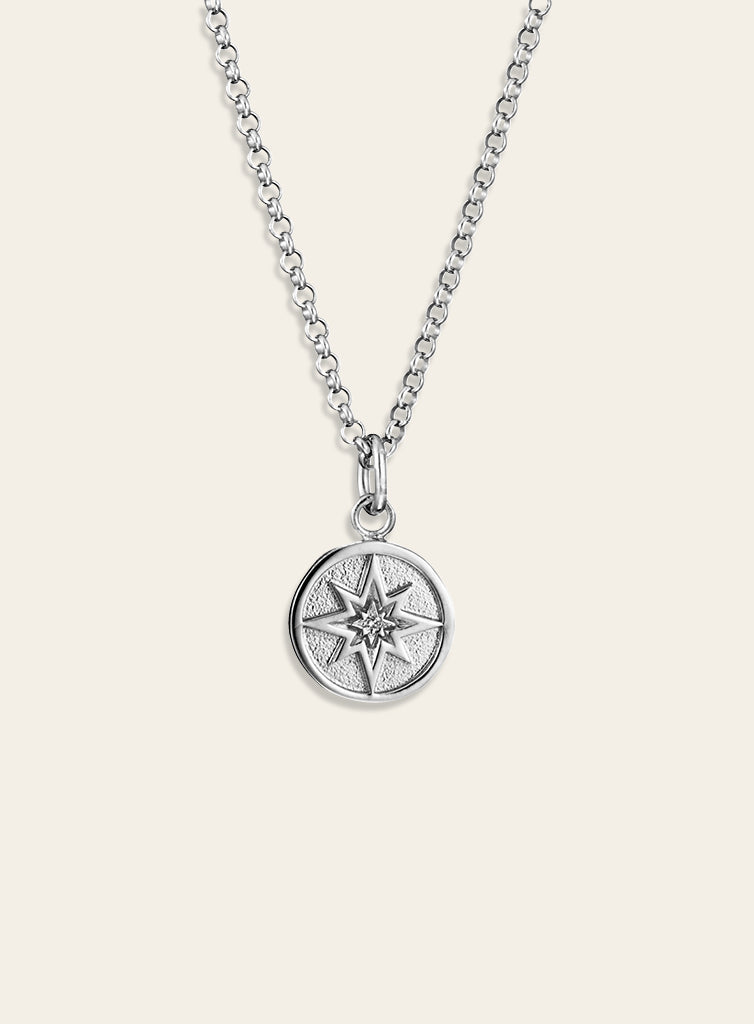 Suunnittelija Heikki Hartikainen Jalokivi Diamond Pintakäsittely Rhodium plated Materiaali Silver Koko 12mm Ketjun pituus 36/38 or 45/50cm Timantit 1x0.01ct Timanttien paino yhteensä 0.01ct Timanttien väri Wesselton Timanttien puhtaus Diamond SI/ Laboratory diamond VS -