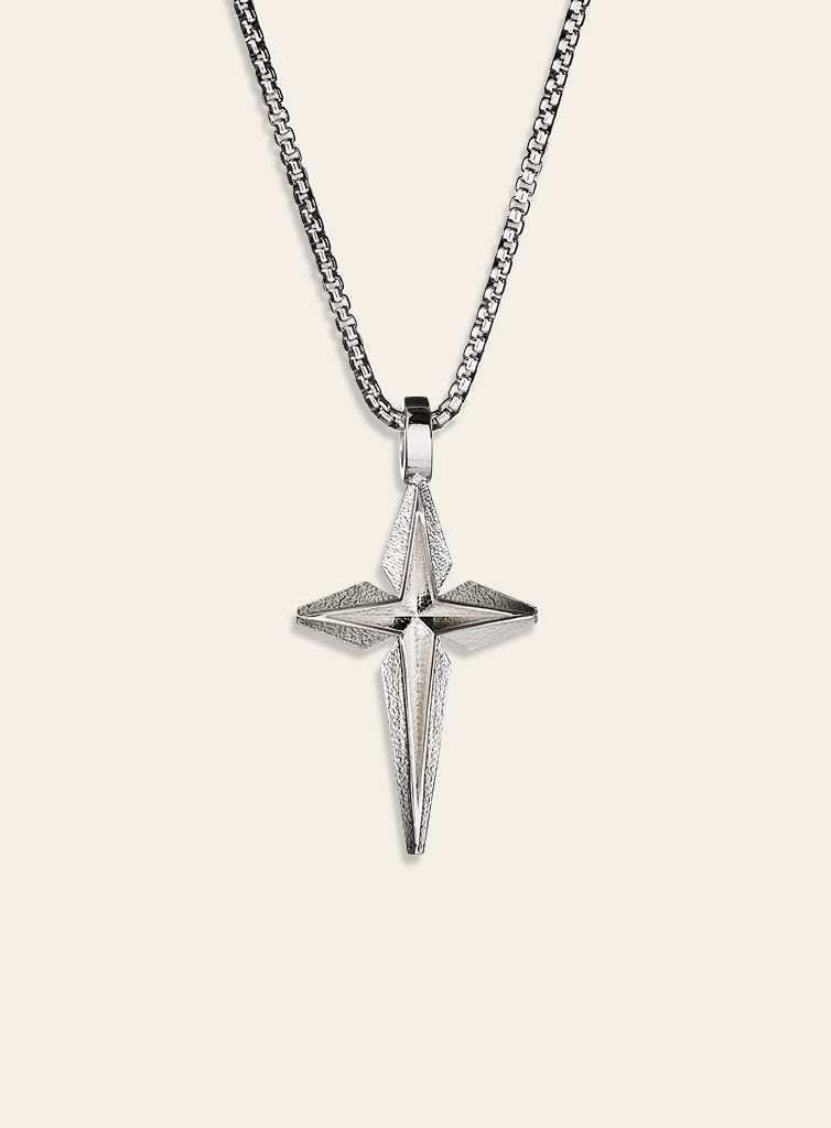 Suojelija is a striking cross whose design draws on the symbolism of the North Star. Its structure, reminiscent of a shooting star, conveys a sense of direction and unwavering guidance. The collection combines strong visual poise with the idea of protection, creating a meaningful reminder of the courage to move toward one’s own purpose.