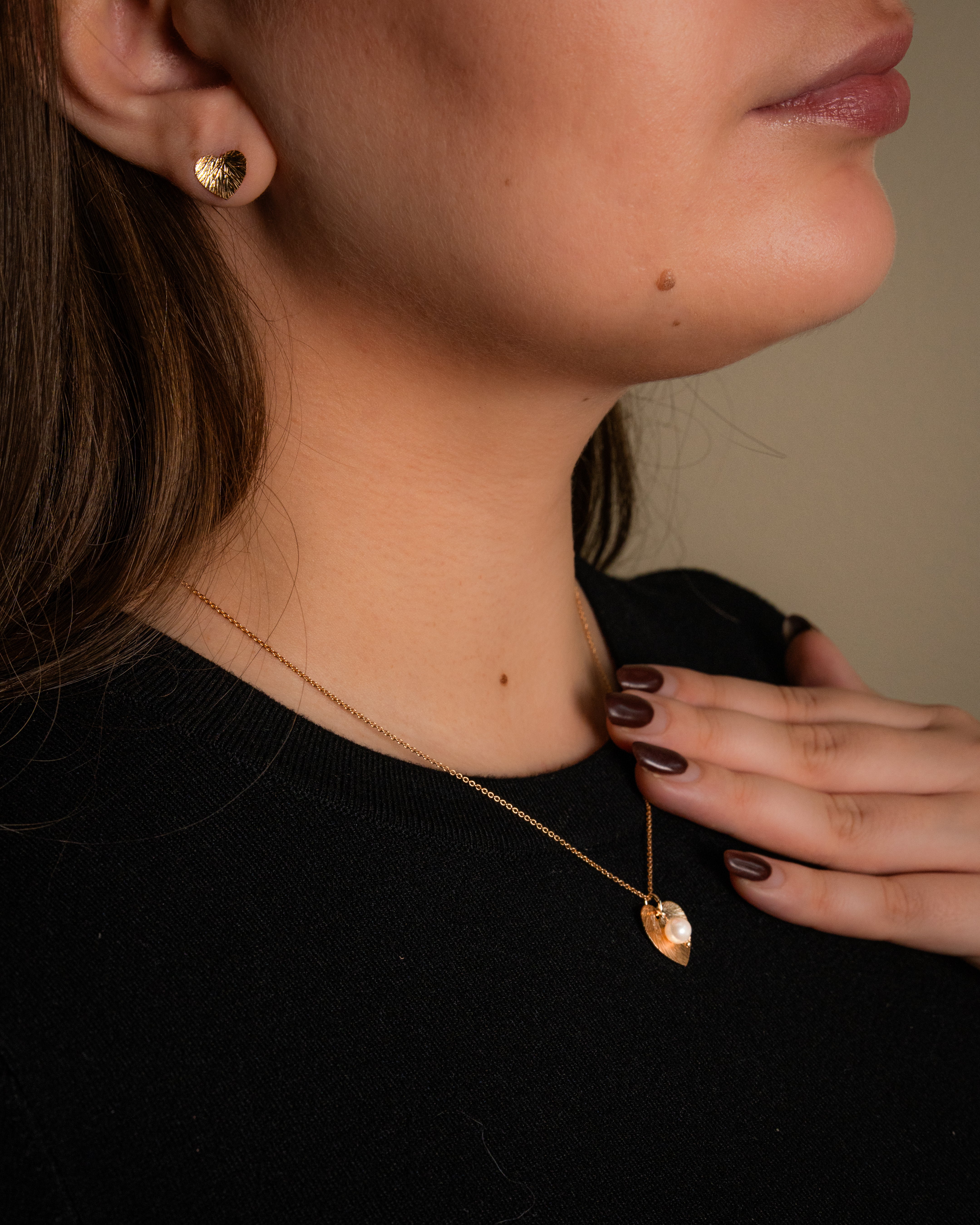 Lily earring has leaf-like texture and heart-shaped design.