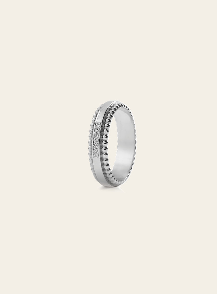 Suunnittelija Carina Blomqvist Pintakäsittely Rhodium plated Materiaali 14K White gold Rungon leveys 5mm Timantit 5x0.01ct Timanttien väri Wesselton Timanttien puhtaus Diamond SI / Laboratory diamond VS -