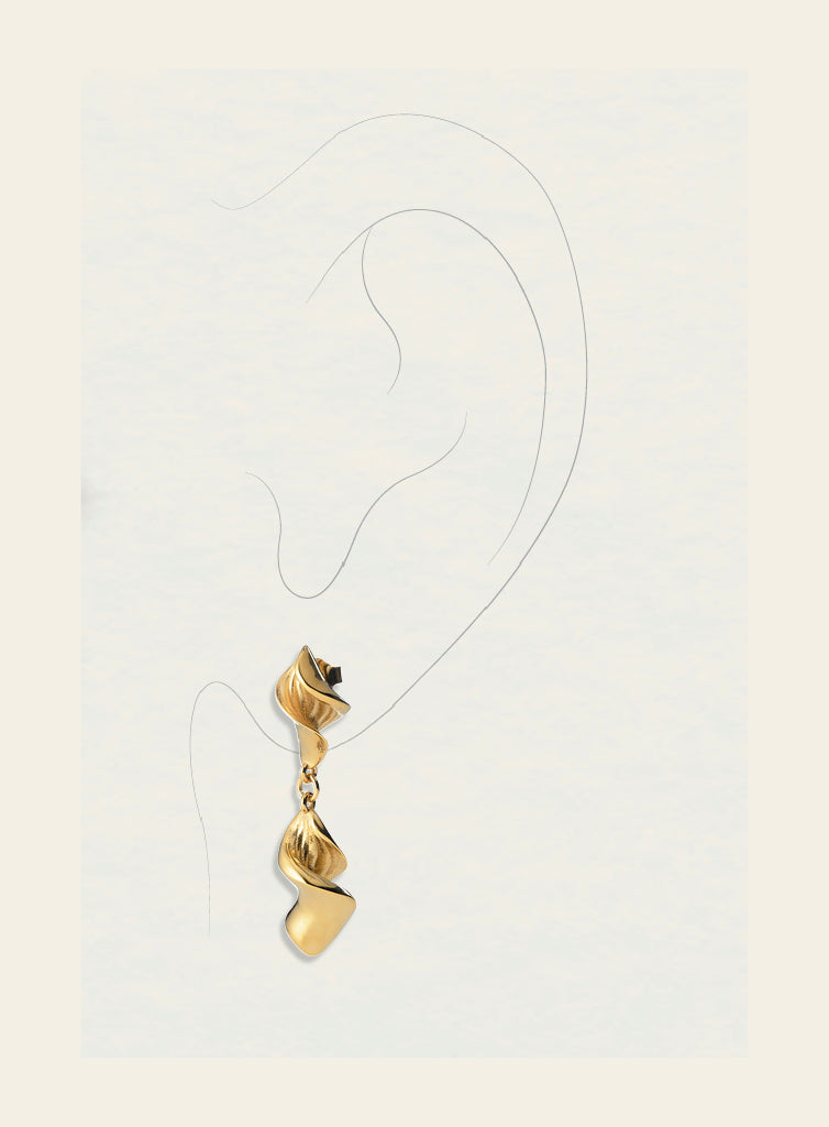 Two spiral-shaped jewelry pieces attached with a loop, which brings three-dimensionality and movement to the jewelry.