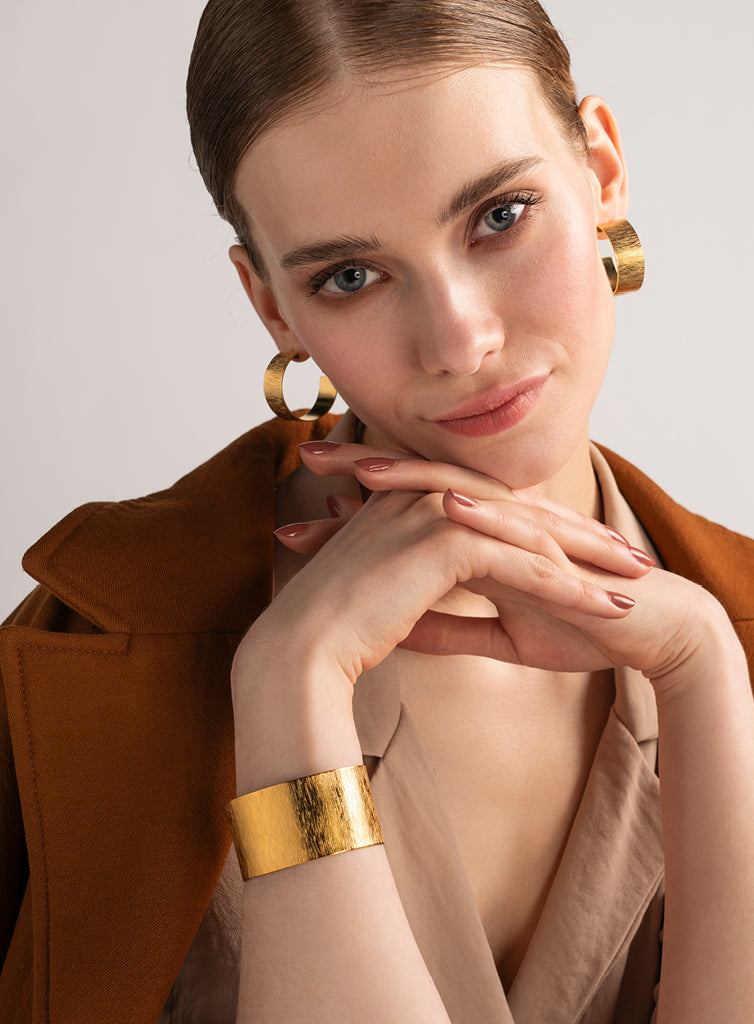 The bangle is 30 mm wide and available in two sizes: Ø59 mm and Ø64 mm. Be sure to explore the matching earrings and gold-plated bangle from the series. Don’t be afraid to mix gold and silver!