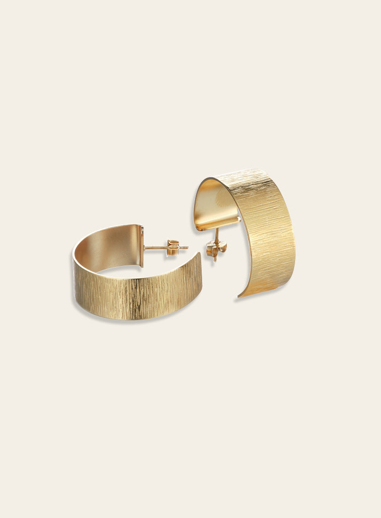 These earrings beautifully frame your face! They measure 12 × 30 mm and are delightfully lightweight. Be sure to check out the matching bangle and silver earrings from the series. Don’t be afraid to mix gold and silver!