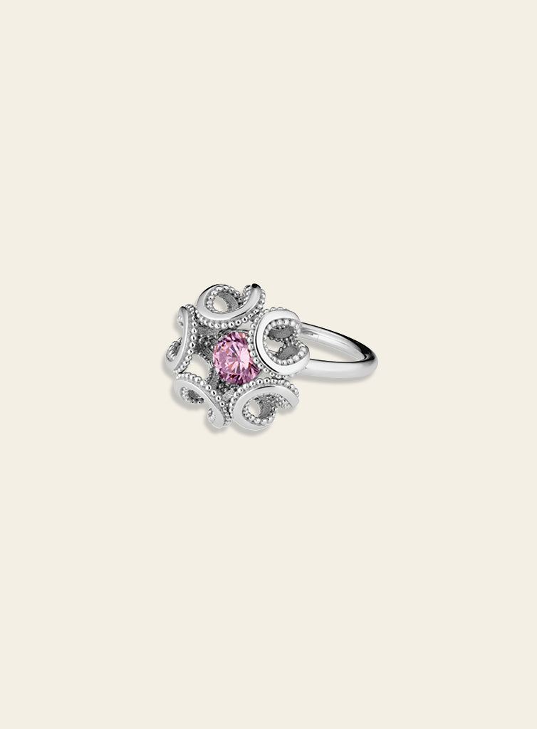 Alma is a modern heirloom where Victorian ornamentation meets the present day. Its lace-like details and precisely set stone create a delicate yet powerful ensemble. With its infinitely repeating petal motif, the jewelry feels like a cherished treasure passed down through generations, carrying the stories of the past and the enchantment of detail to the future.