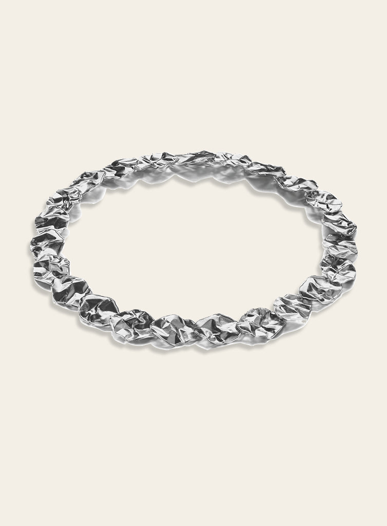 Vuoksi is a celebration of nature’s unpredictability and the freedom of material. Its vibrant, crumpled surface is born from the meeting of handcraft and chance, with each fold capturing light in a unique way. It is design where untamed beauty and movement reminiscent of flowing water come together in a lasting form.