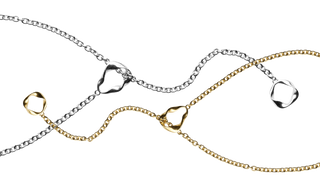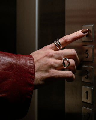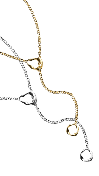Two irregularly shaped, shiny rings and a strong chain create a bold and modern look. The locking mechanism is part of the jewelry, ensuring easy adjustability and a comfortable fit without a separate lock.
